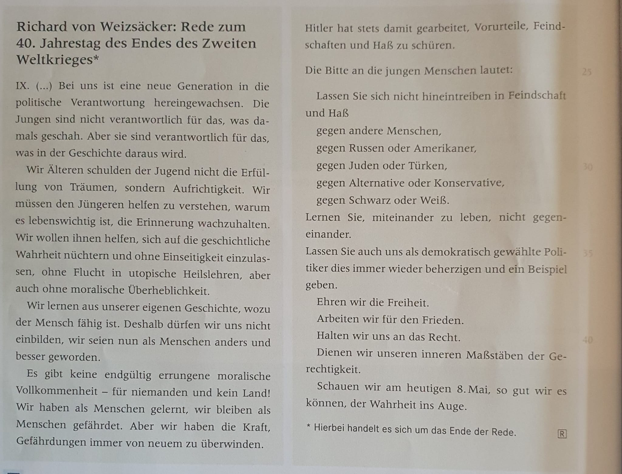 Guten Tag, ich habe in Deutsch eine Redeanalyse geschrieben über die Rede von Richard von Weizsäcker zum 40. Jahrestag vom Ende des 2.Weltkrieges. Ich wollte wissen, ob etwas wichtiges fehlt bzw. nicht richtig analysisiert wurde. Außerdem würde ich gerne wissen, ob du diese Redeanalyse von mir Gut findest. Ich habe den Text sowie meine Analyse als Bild eingefügt.