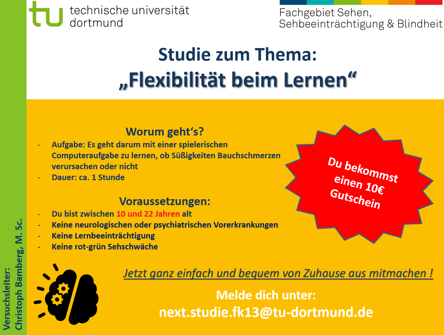 Als Dankeschön für die Teilnahme erhalten die Proband*innen einen Gutschein im Wert von 10€ für Decathlon oder den Onlineshop der Thalia-Buchhandlung. Die Studie wird durch Gelder aus dem Sonderforschungsbereich 1280 des DFG finanziert. Mehr Informationen gibt es unter sehen.fk13.tu-dortmund.de/cms/…nsereprojekte/FLEXIT.html