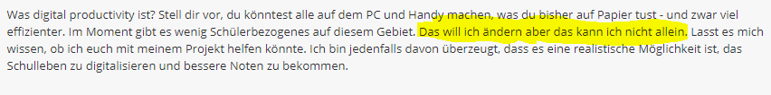 Mein Plan ist es ein Netzwerk von Schülern zu schaffen, in dem sich Schüler rund um dieses Thema austauschen. Mein persönlicher Fokus ist Digital Productivity. Ich schreibe keine Lernzettel mehr, mache nur das, was ich für zielführend halte und gehe stressfrei und mit wenig Arbeitsaufwand auf das bald anstehende Abitur zu. Mein Zeugnis war noch nie so gut und mit den lernstrategischen Erfahrungen habe ich unglaublich wichtige Voraussetzungen für Studium und Karriere geschaffen. Bedenkenlos auf die Abschlussprüfung zu schauen kann jeder und jede, der/die digital productivity ausprobiert hat, glaub mir.