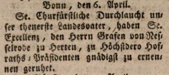 Seine Kurfürstliche Durchlaucht unser theuerster Landesvater, haben Seine Excellenz, den Herrn Grafen von Reffelsrode zu Herzen, zu höchstdero Hofraths-Präsidenten gnädigst zu ernenne geruhet.