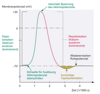 Ausgelöst wird ein Aktionspotenzial durch das Öffnen Neurotransmitter-gesteuerter Natrium-Kanäle in der Membran. Durch diese strömen Na+ Ionen entlang ihres Konzentrationsgradienten in die Zelle hinein und die positive Ladung im IZR (Intrazellulärraum) zu und die im EZR (Extrazellulärraum) ab. Die Ladungsdifferenz zwischen beiden Räumen wird kleiner und es kommt zur Potenzialverschiebung. Das Membranpotenzial steigt an, ab ca. -55mV öffnen sich zusätzlich spannungsabhängige Natrium-Kanäle. Es strömen nun explosionsartige viele Na+ Ionen in den IZR. Dadurch steigt das Membranpotenzial an und es entsteht ein Aktionspotenzial -> Depolarisation.