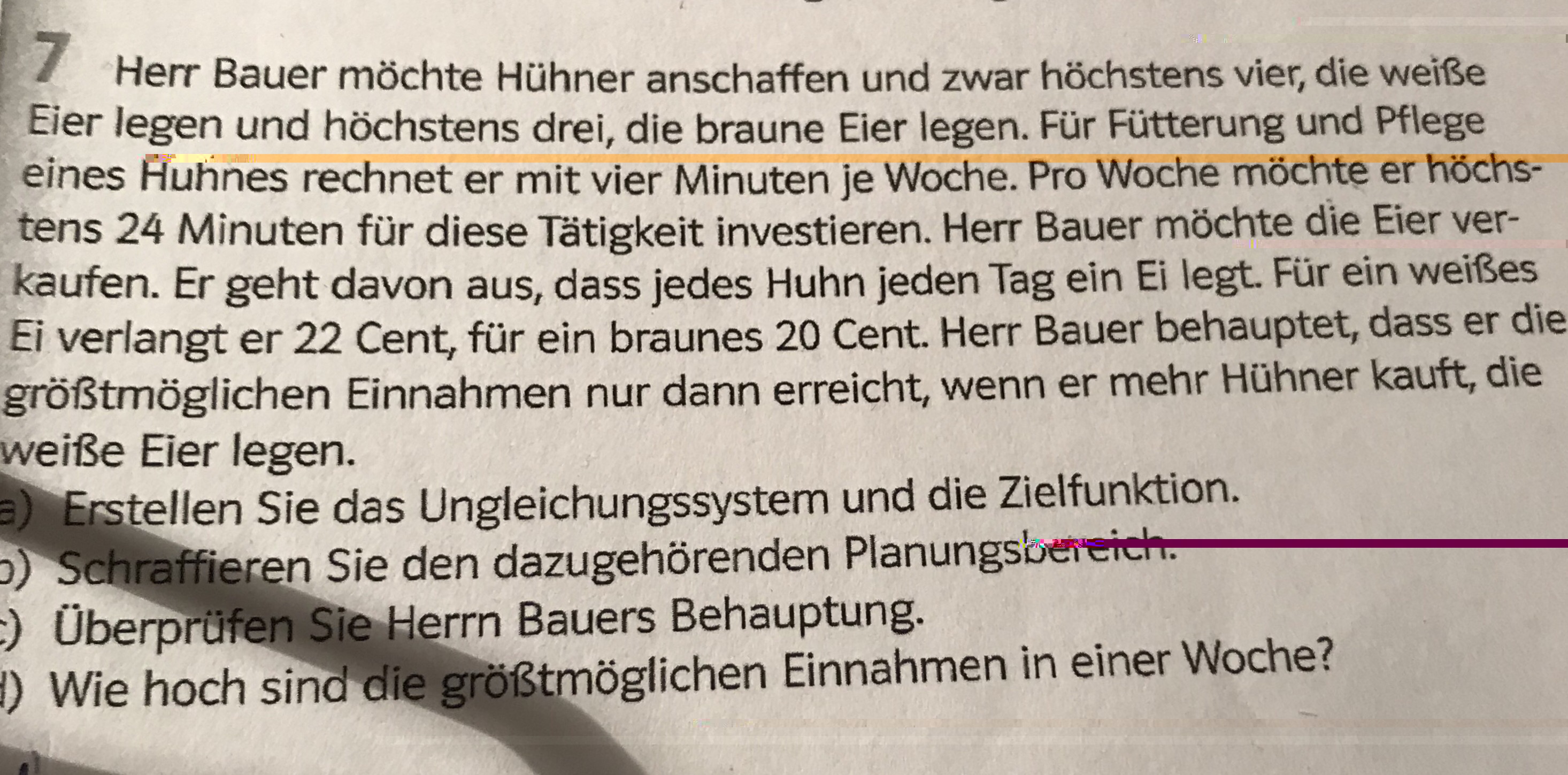 wir behandeln in der Schule gerade das Thema ,,lineare Optimierung“ und ich komme damit ÜBERHAUPT NICHT klar ;(;(;(;( . In der Schule verstehe ich es leider auch nicht.Wir schreiben bald eine Klausur und bis dahin will ich das Thema unbedingt draufhaben. Ich habe im Anhang eine Beispielaufgabe reingesetzt. Es wäre SUPERLIEB!!!, wenn mir jemand zu dieser SCHRITT-FÜR-SCHRITT Lösungswege geben könnte. Dabei sollten folgende Schritte mit eingebracht sein, weil wir das in der Schule auch so machen: