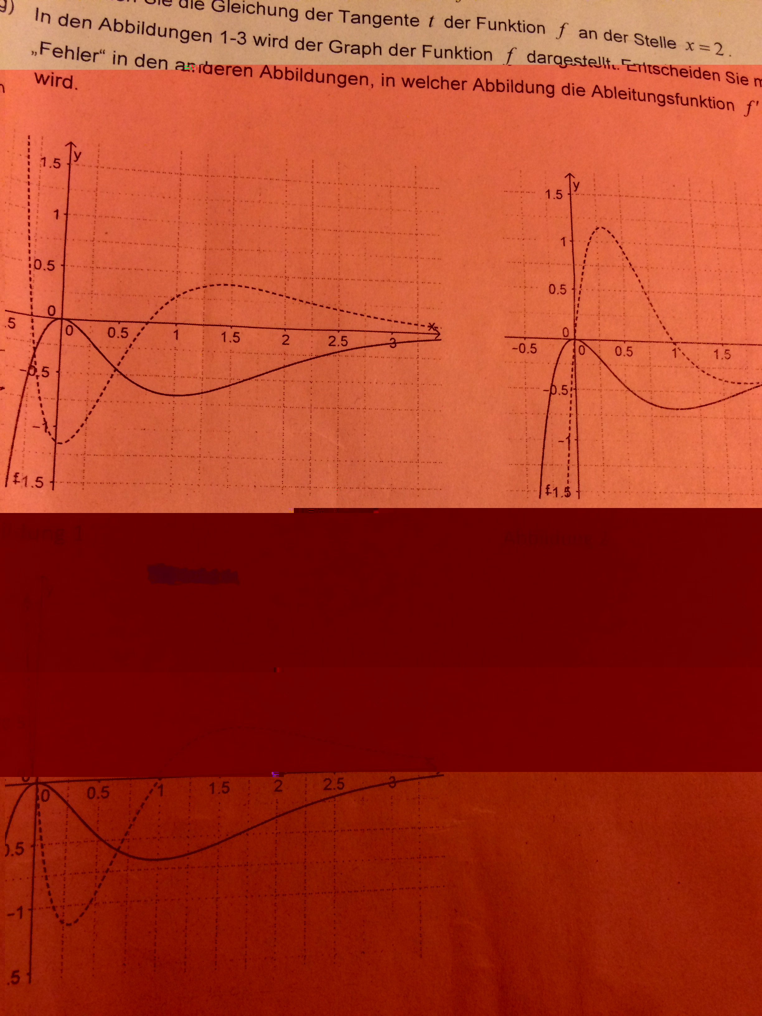 Die Aufgabe lautet " In den Abbildungen 1-3 wird der Graph der Funktion f dargestellt. Entscheiden Sie mit Hilf der Fehler in den anderen Abbildungen, in welcher Abbildung die Ableitungsfunktion f´korrekt dargestellt wird